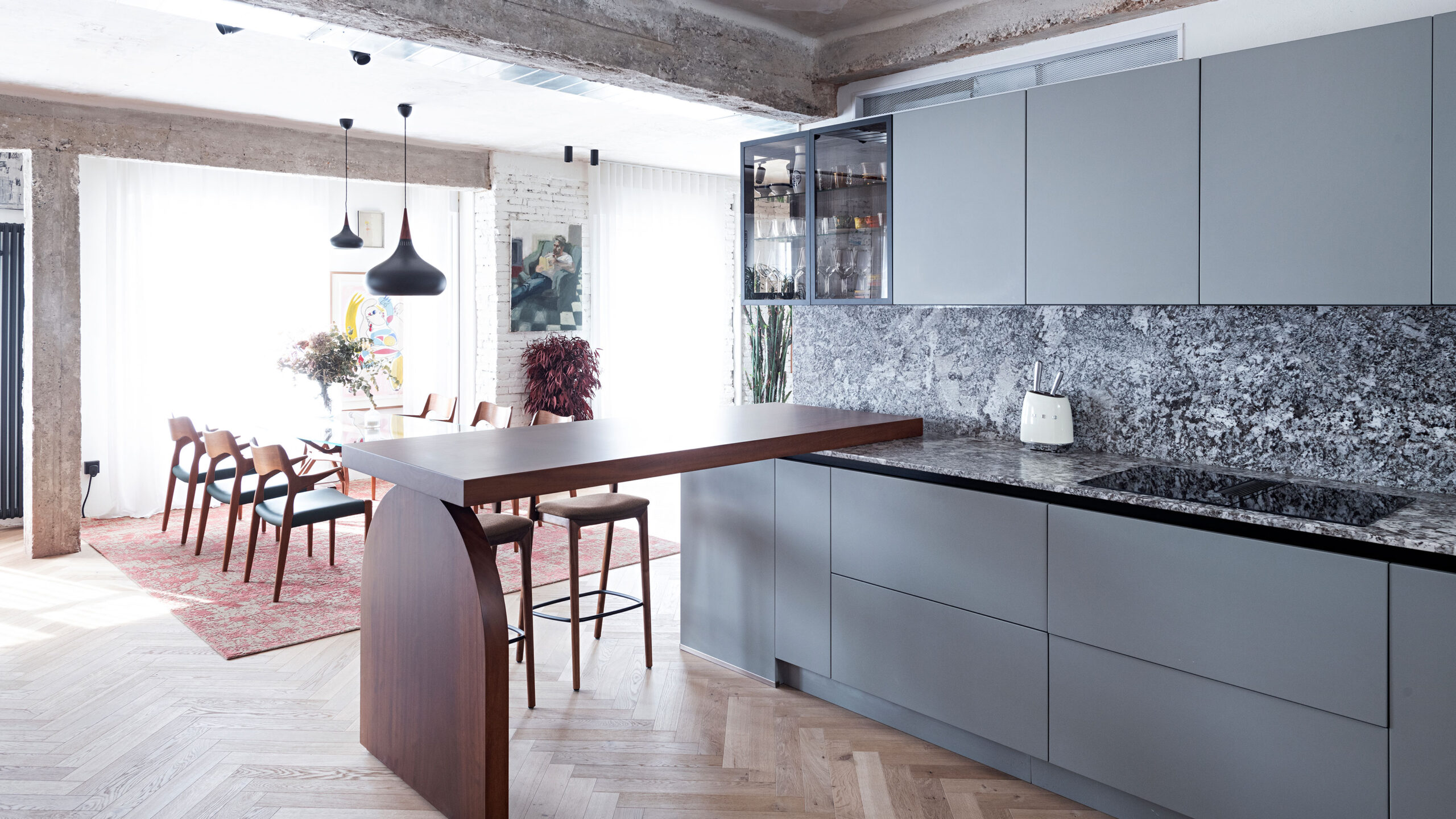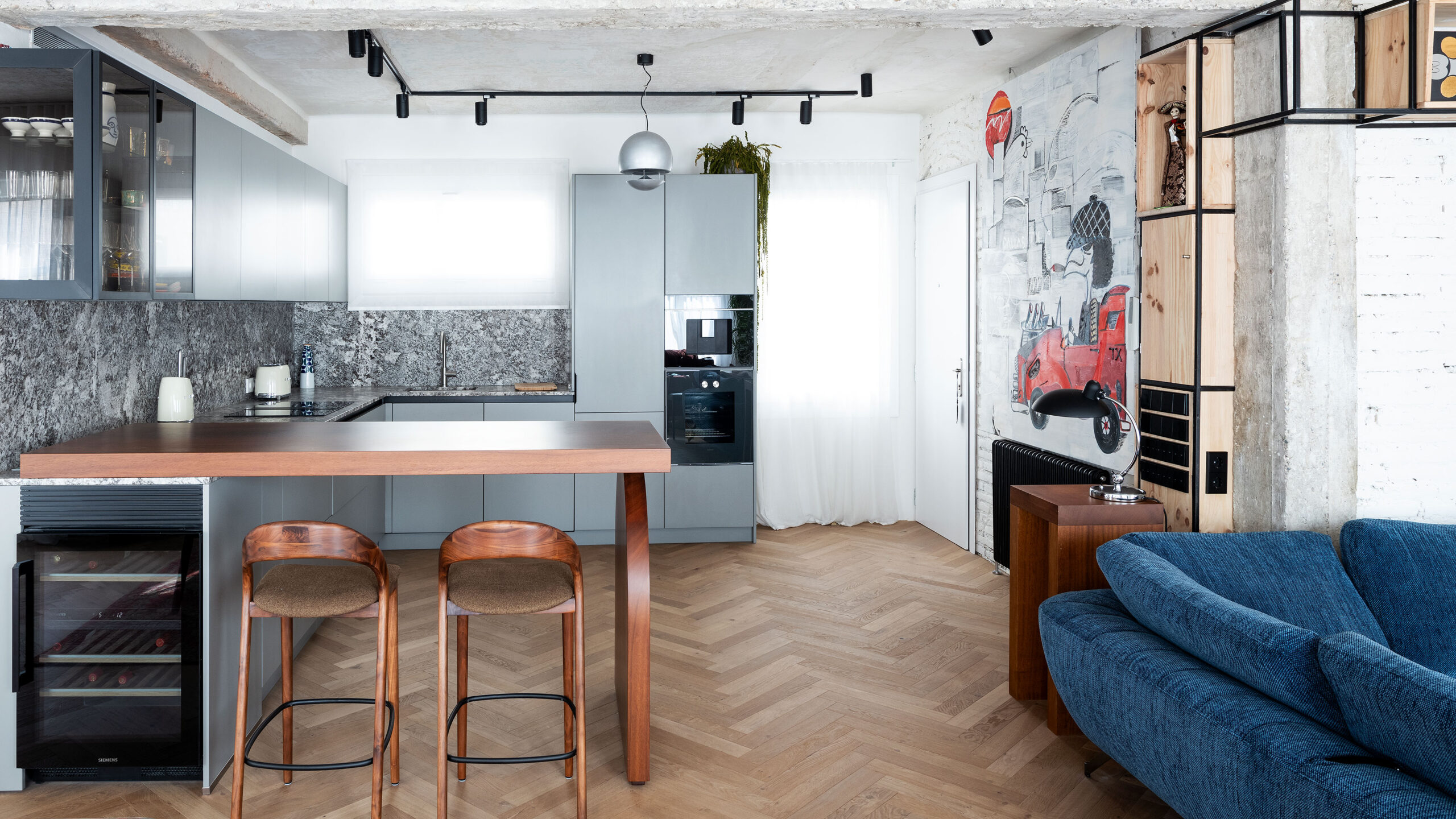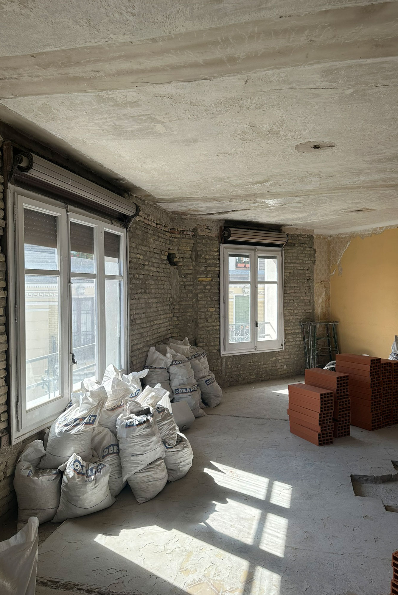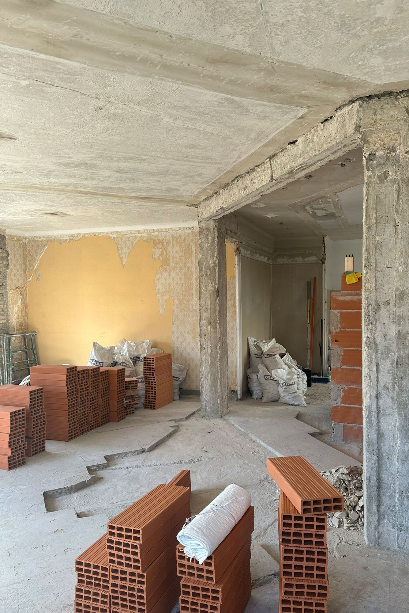 The project kicked off with a thorough demolition and removal of all the walls to expose the apartment’s original materials and textures. The process revealed an expressive combination of brick walls and concrete elements, which were cleaned, restored and left exposed. This brutalist shell is complemented by a herringbone oak floor that introduces warmth and evokes the bourgeois and domestic character of the original dwelling. The less valuable or damaged walls were painted to achieve a balanced, neutral backdrop.