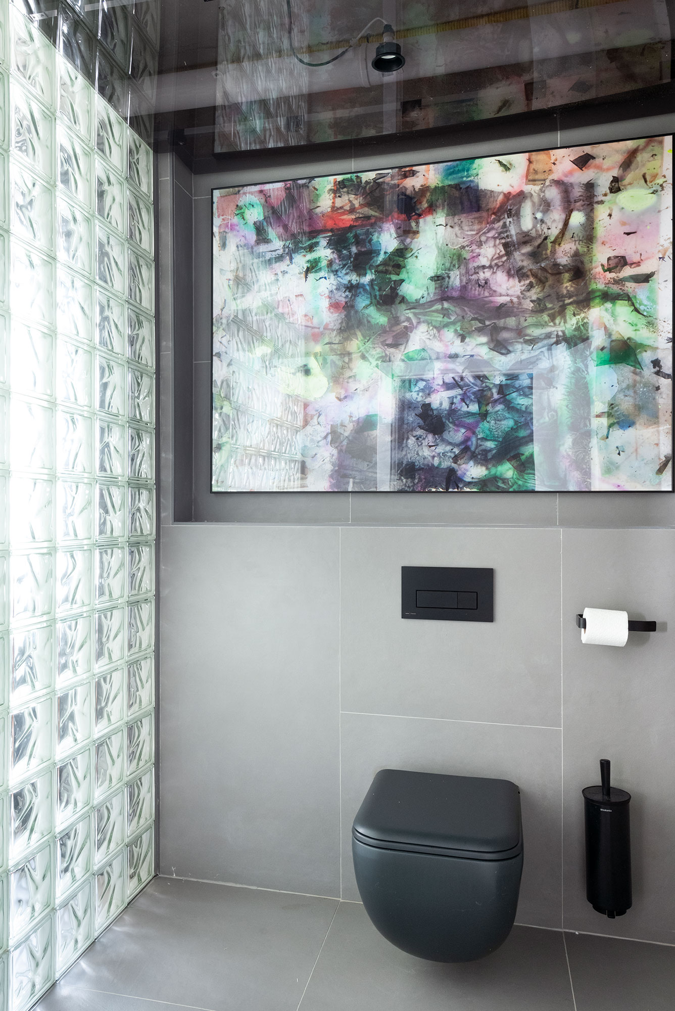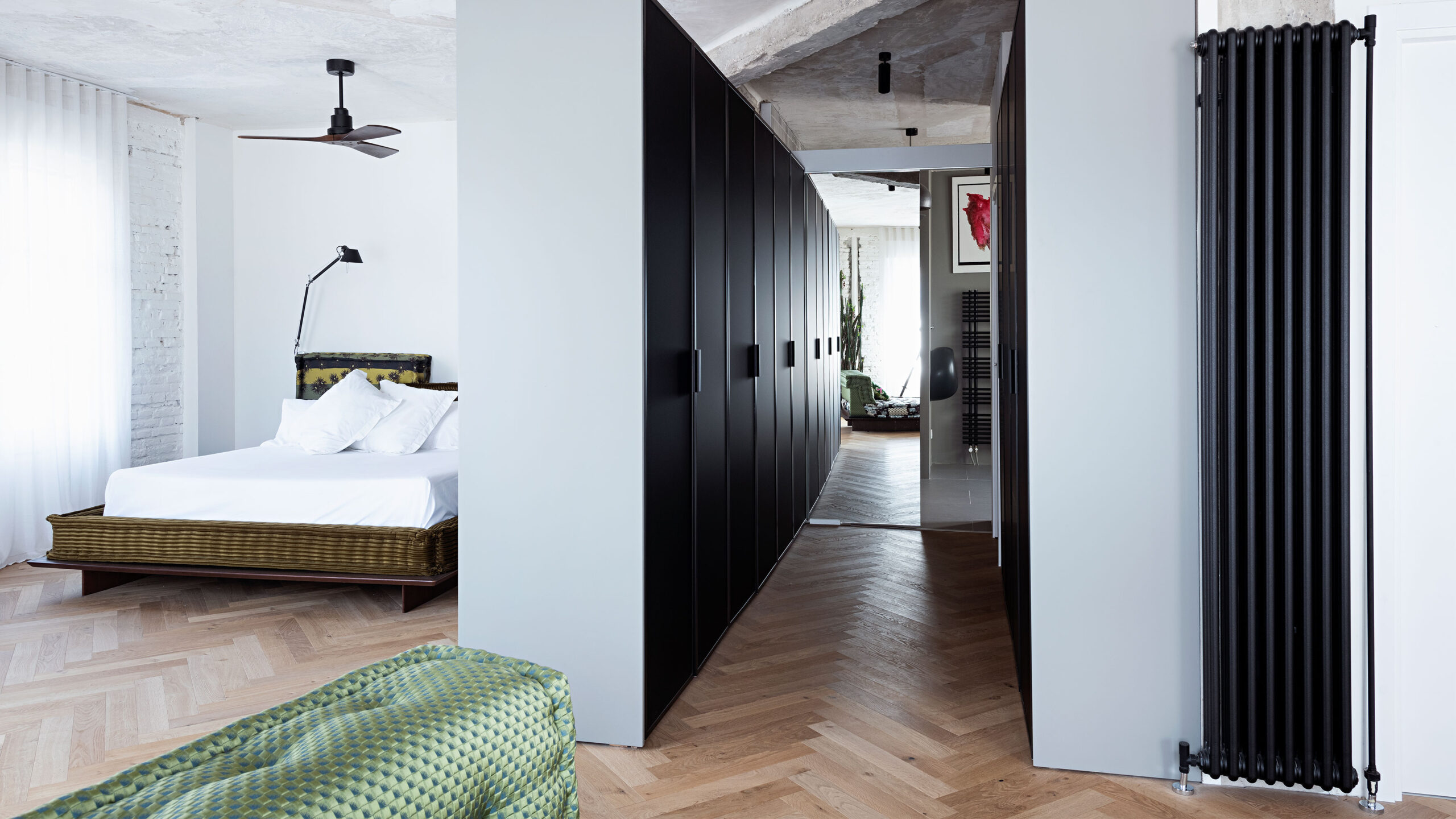 The vertical rhythm of the windows is echoed by equally vertical radiators in a charcoal-black finish. Rather than concealing them, the design treats these as part of the interior design, integrating them into a furniture ensemble that combines neutral and colorful pieces with the owner’s private art collection.