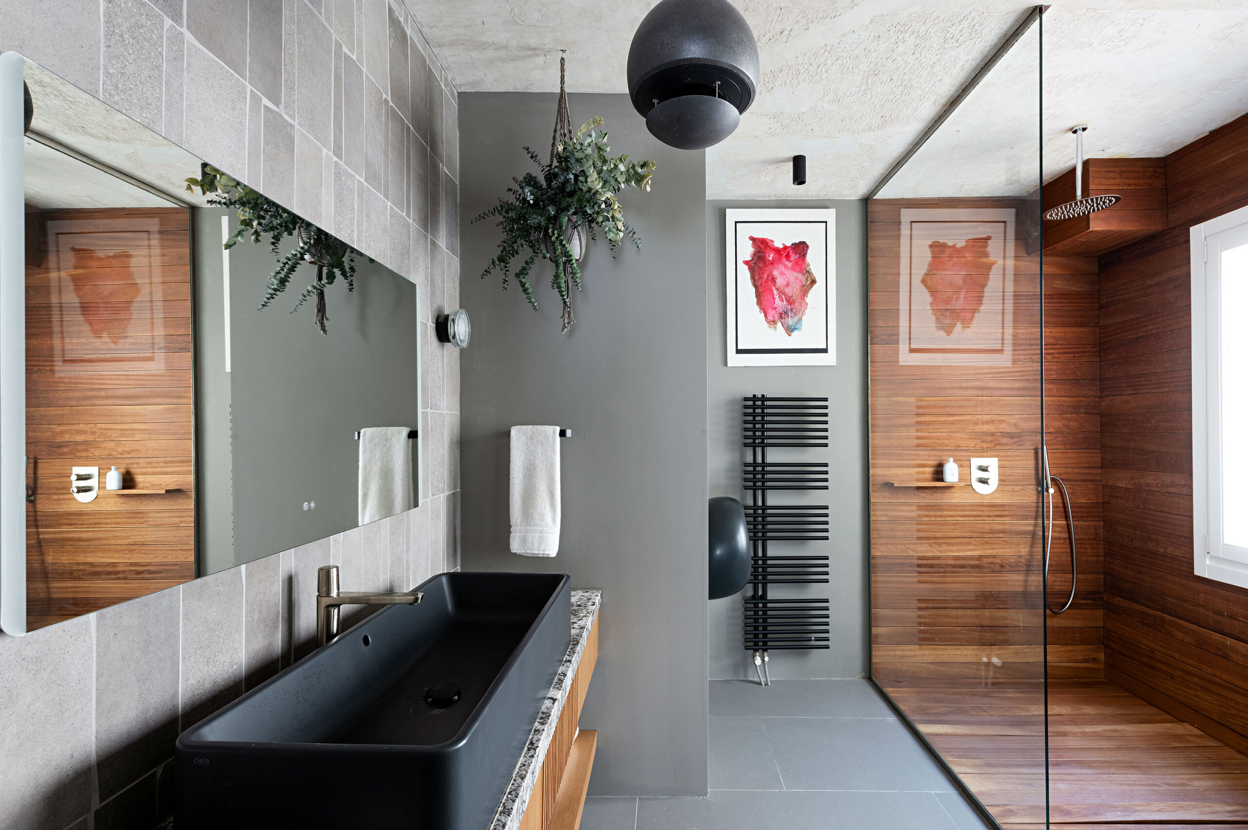 The bathroom, comfortable and efficient, features a spacious shower clad in wood as its central element.