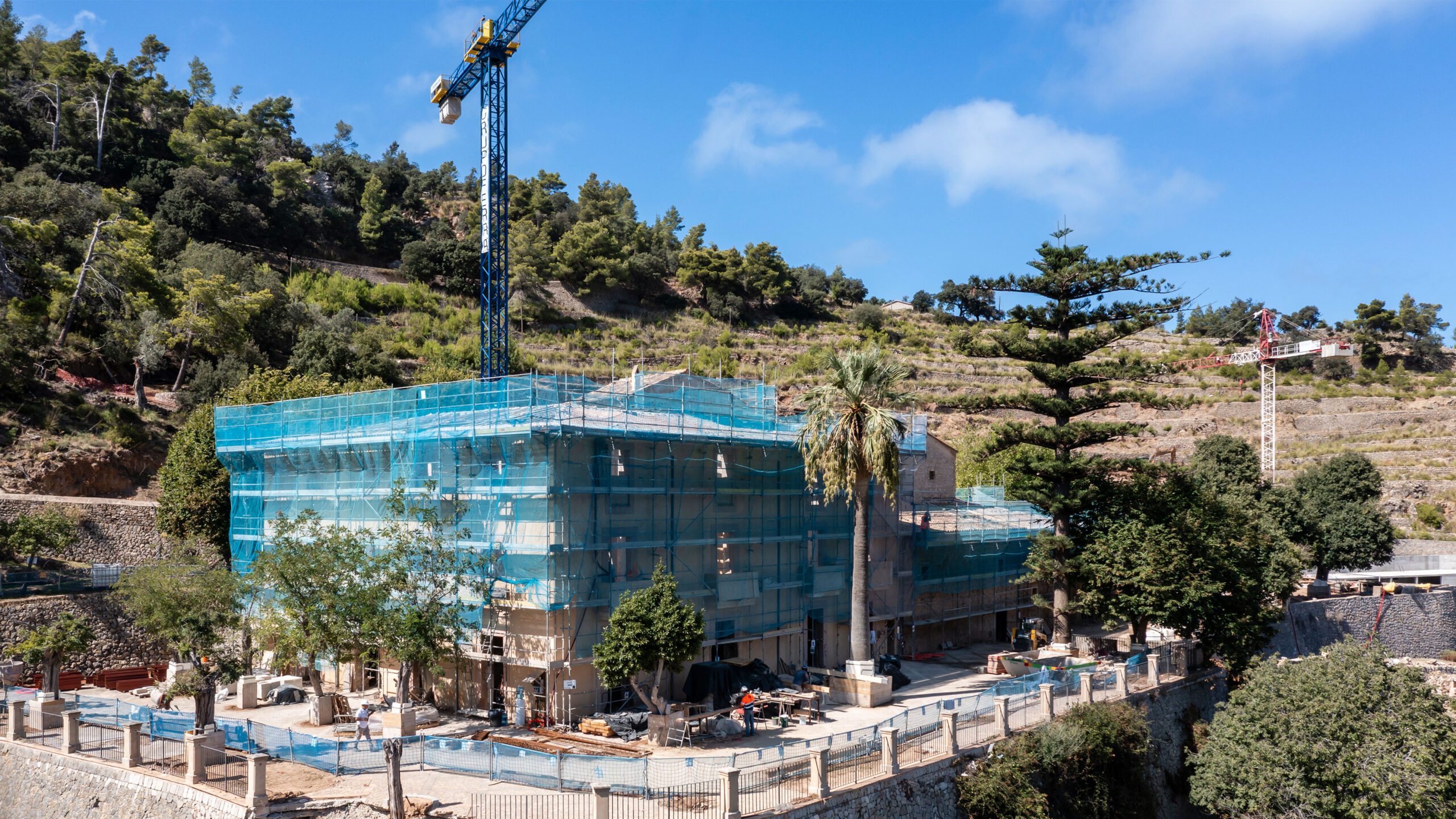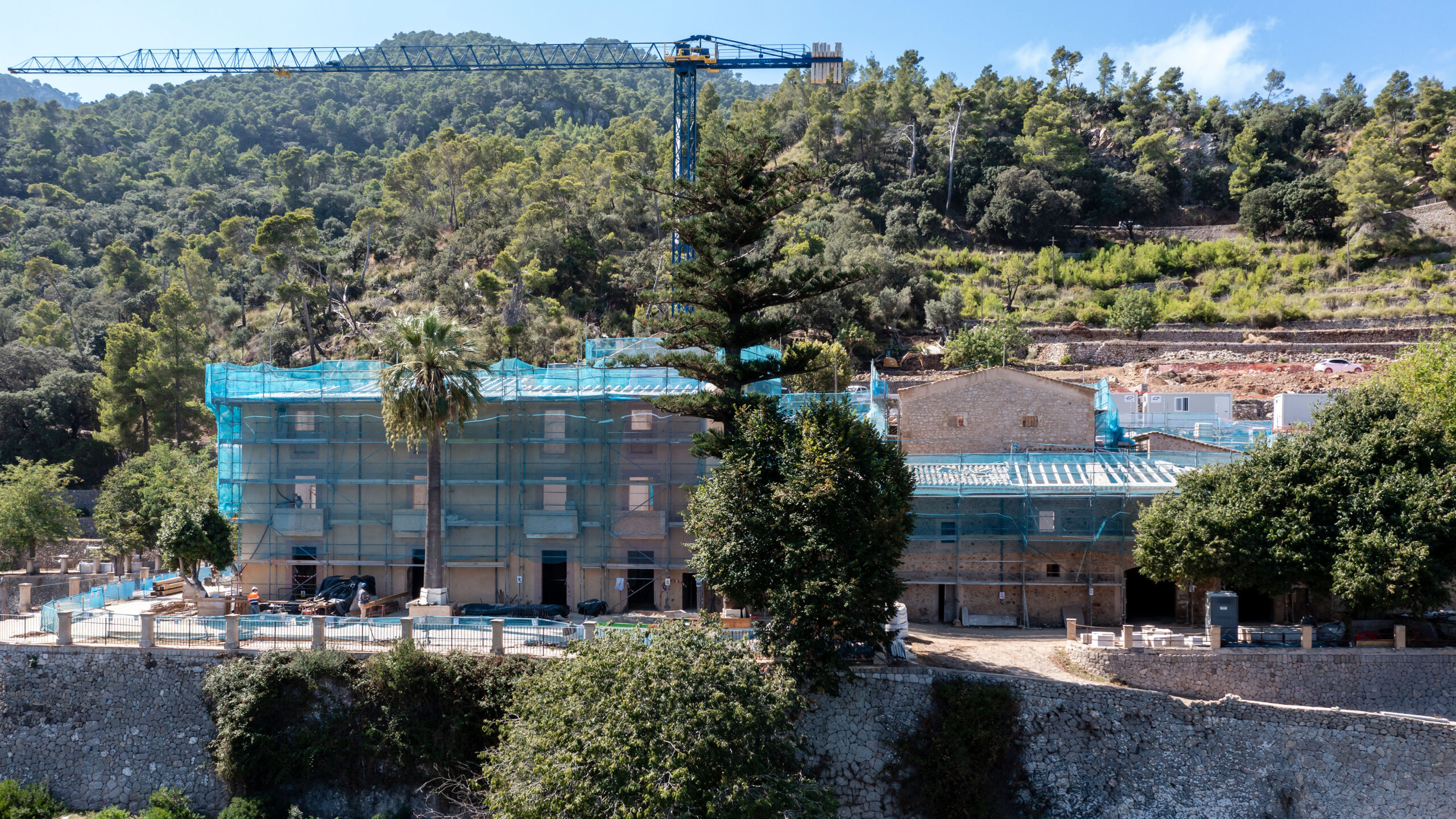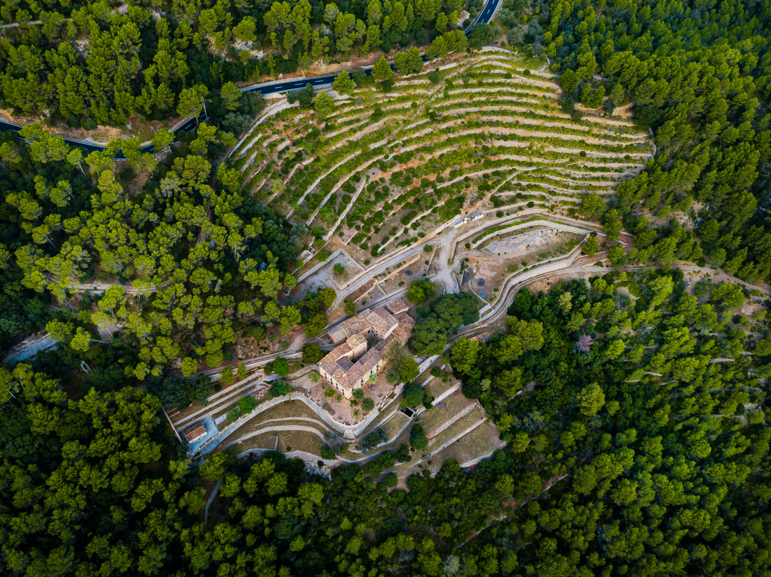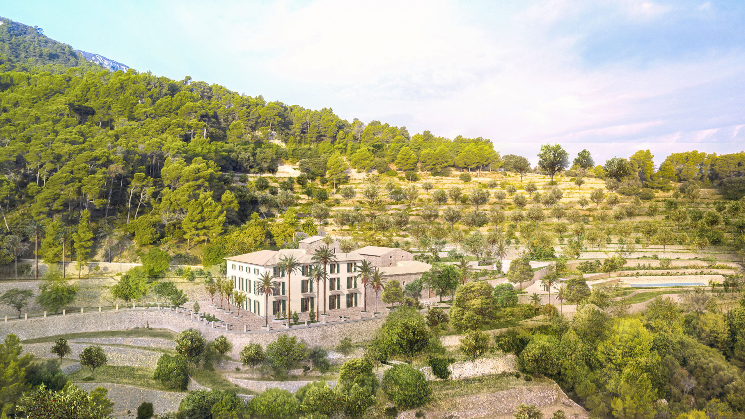 Nestled in the heart of Banyalbufar, within the protected landscape of the Serra de Tramuntana mountains, a UNESCO World Heritage Site, lies Son Valentí, a Mallorcan estate with documented origins dating back to the 16th century. Directly facing the Mediterranean, the estate occupies a territory shaped over centuries by agricultural work and coastal defense, where elements such as the defensive tower, documented in 1517, and the traditional oil mill remain as key pieces in the evolutionary sequence of the property.