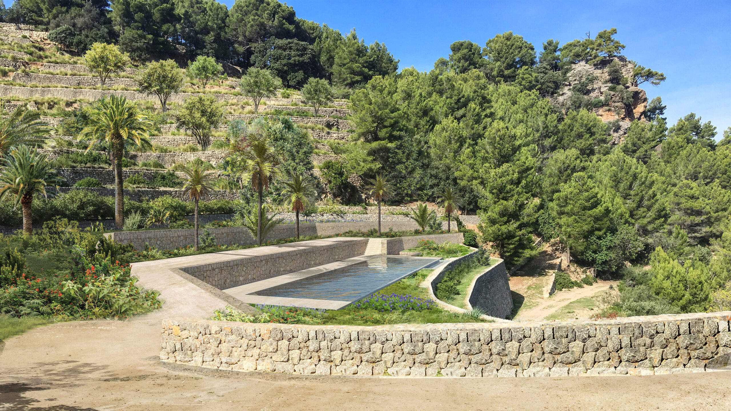 Historically conceived as a self-sufficient estate, Son Valentí incorporated a complex hydraulic system of cisterns, channels and water basins. This system has been carefully restored and reactivated as part of the project’s environmental strategy, maintaining the original logic of rainwater collection and storage for garden irrigation. In addition, the hotel integrates its own water purification system that will allow for its complete reuse, without generating waste.