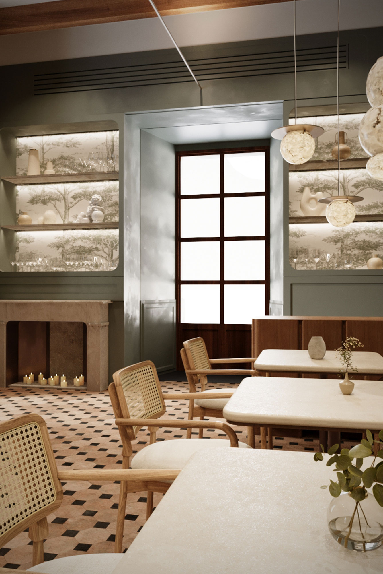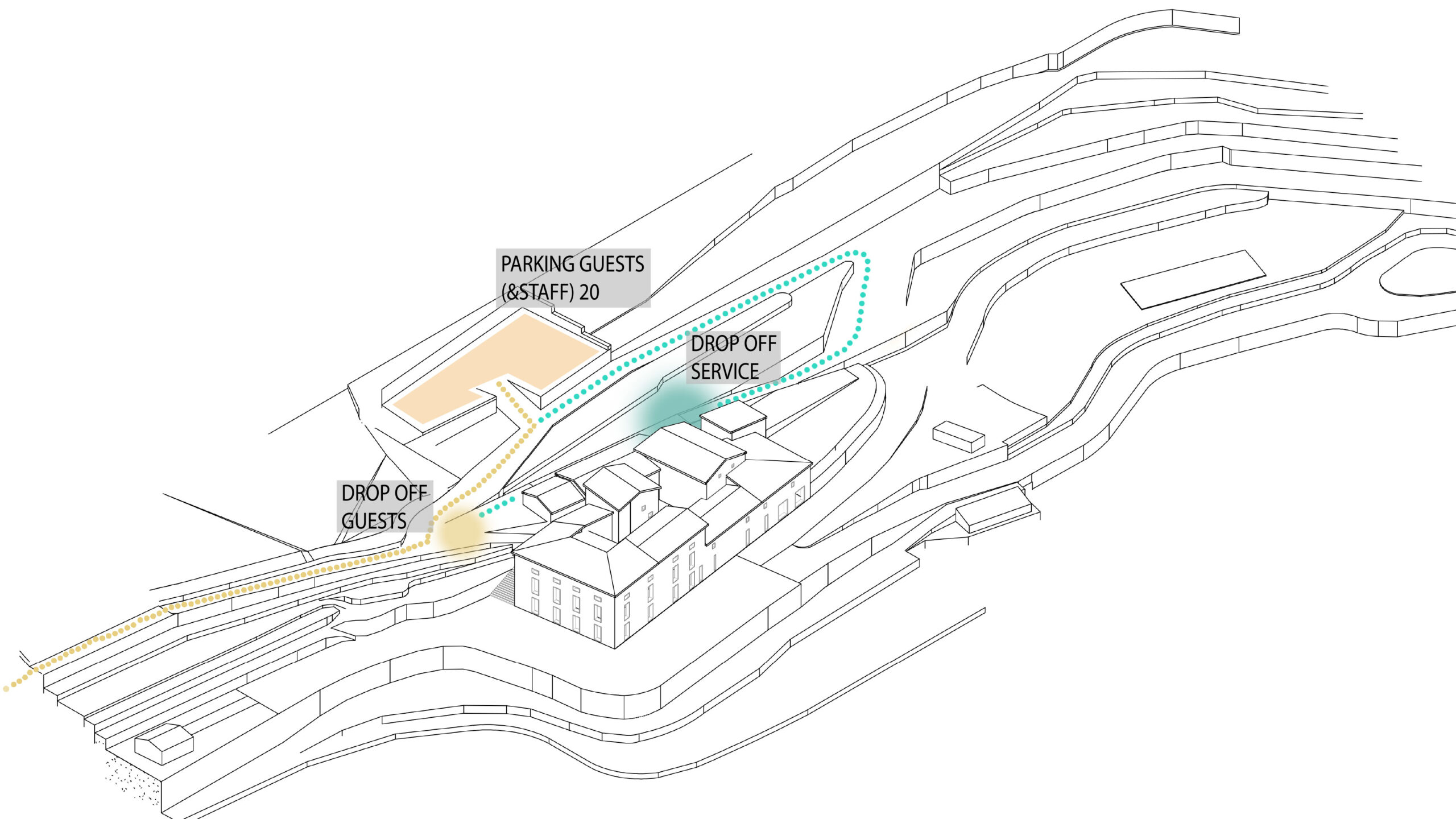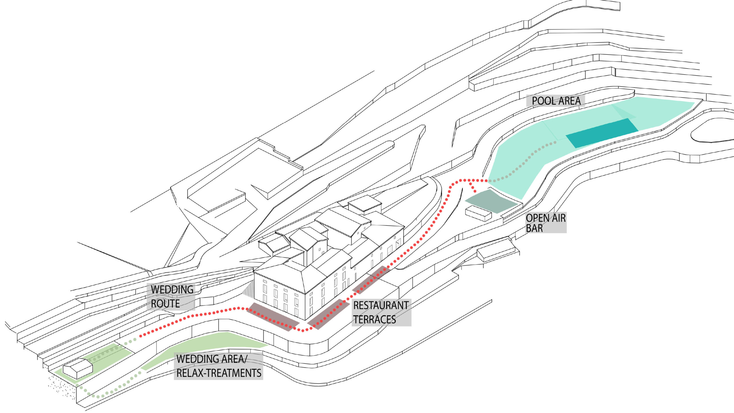 The public program is mainly located on the ground floor, accommodating reception, restaurant, kitchen, gym and treatment rooms, while guest rooms are arranged on the upper levels.