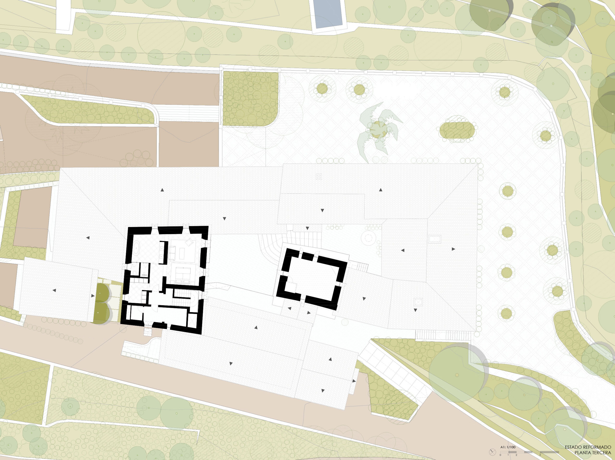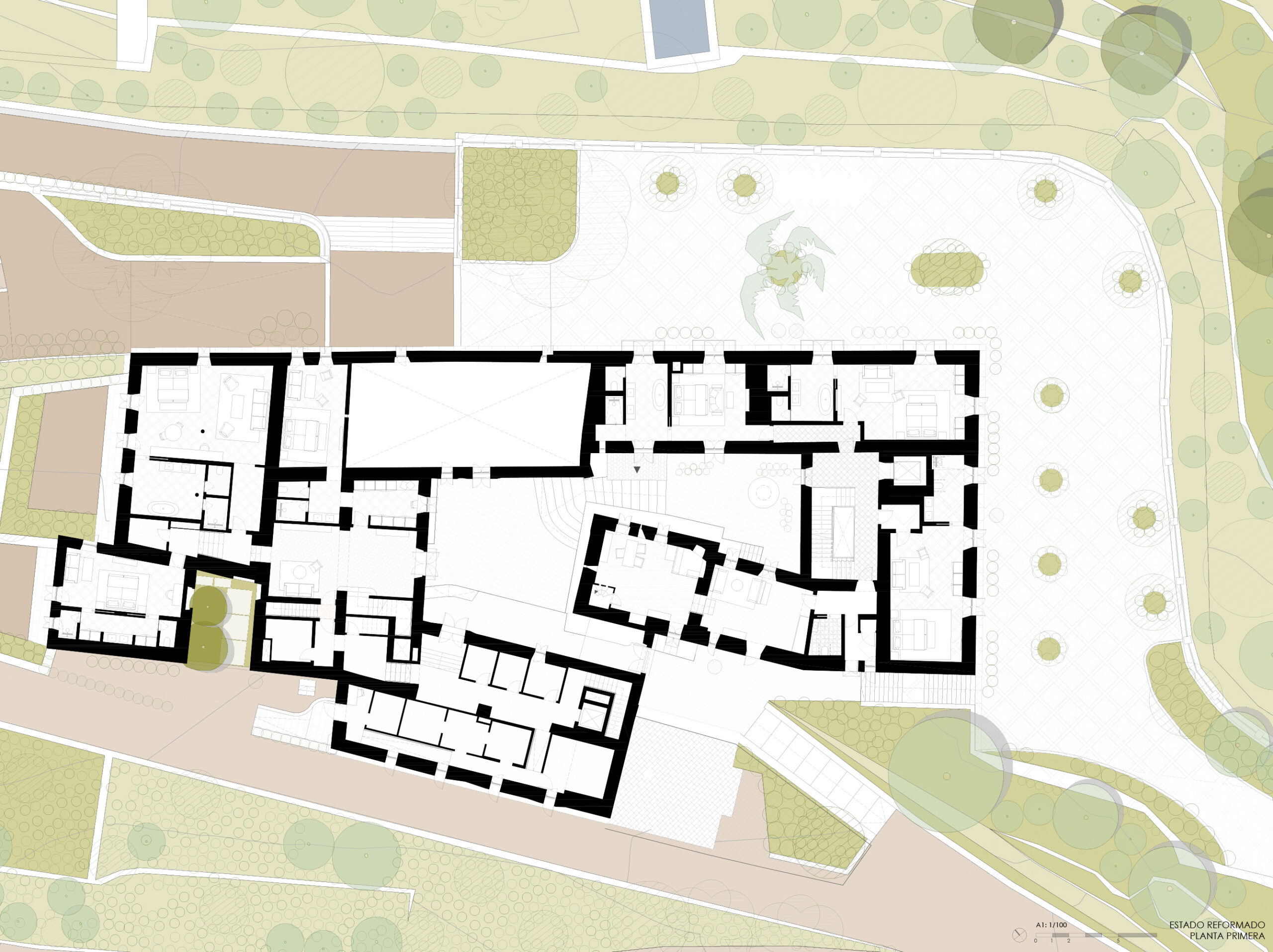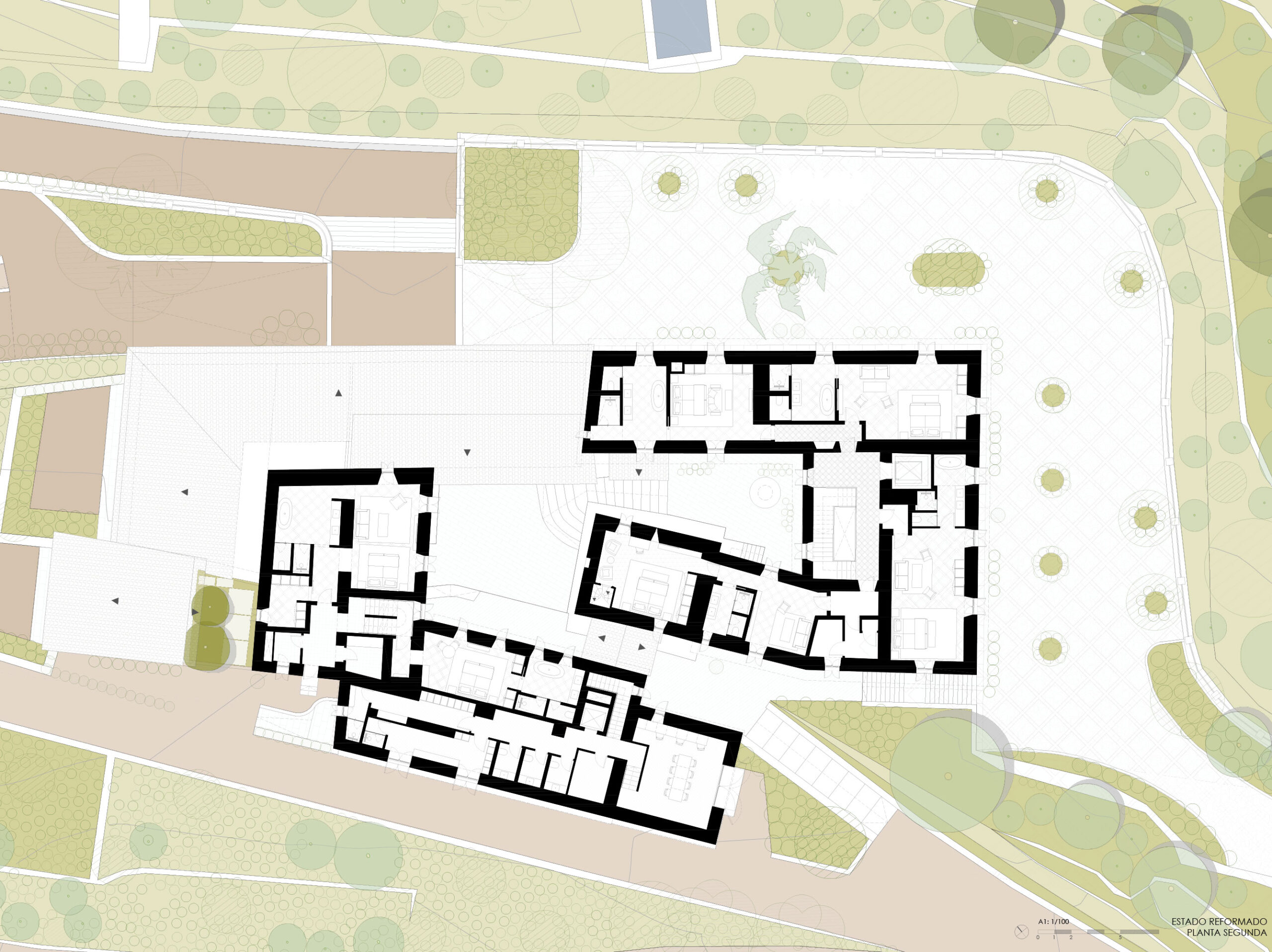The landscape design of the central courtyard, gardens and terraces prioritizes native vegetation and respects the original layout of stone pavements, wells and traditional hydraulic elements. The result is a coherent and restrained intervention that understands architecture as a continuation of the territory: a contemporary refuge rooted in history, where built form, landscape and memory converge in quiet balance.