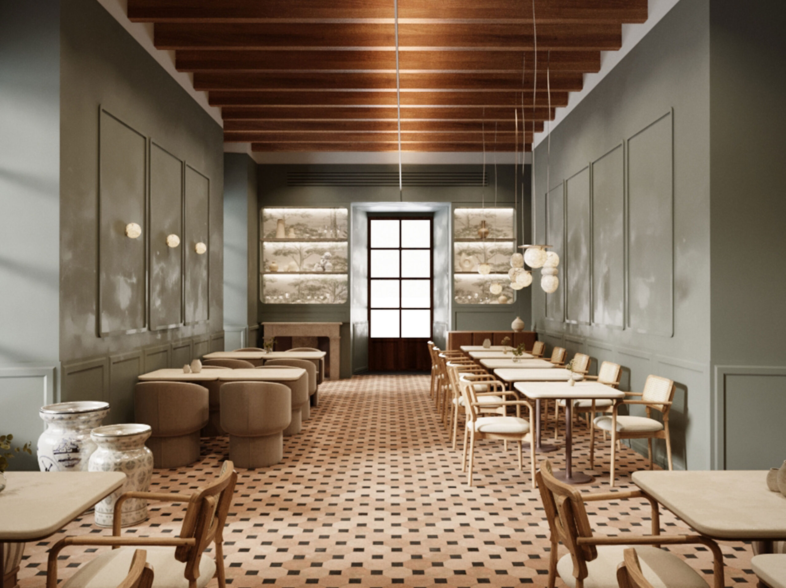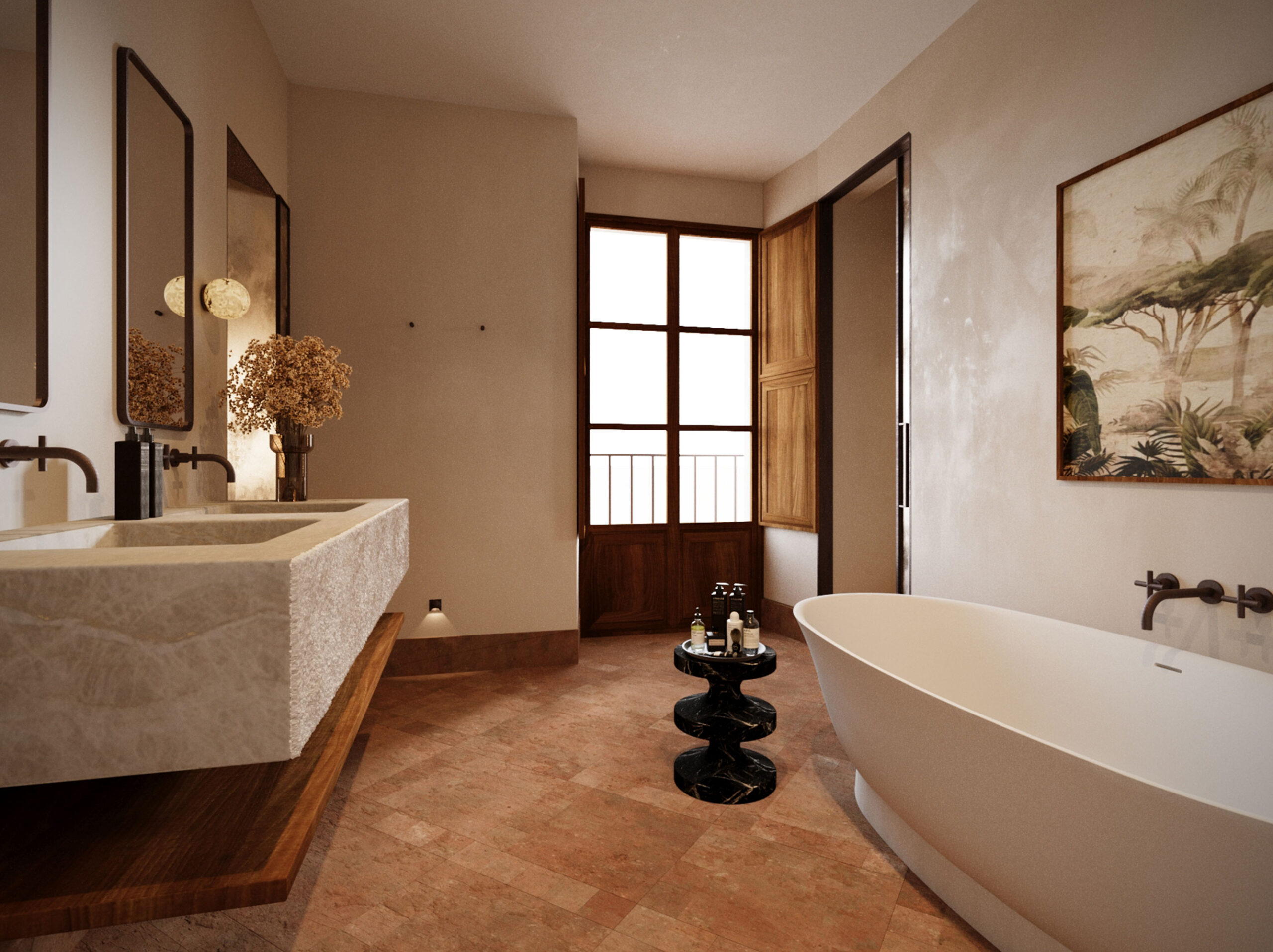 The interior design is sober and respectful of the context, allowing the architecture to speak for itself through the use of noble, traditional, and local materials such as marès stone, restored woodwork, hydraulic floors, and lime mortars.