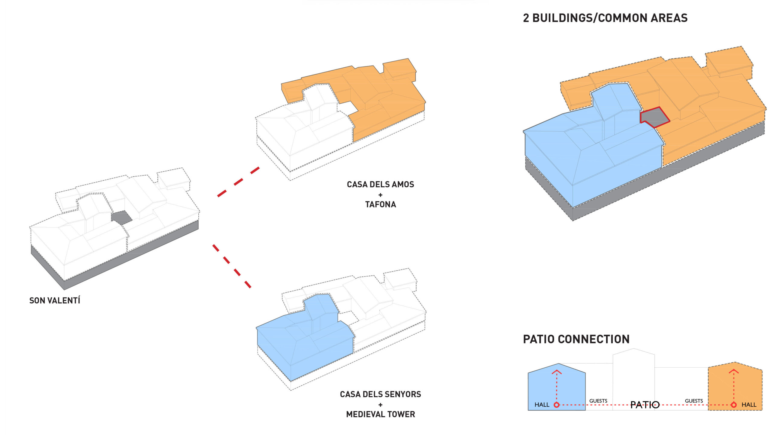 The program is organized around two main volumes: the Casa dels Senyors, the former owners’ residence, characterized by its ochre-rendered façades and a more formal architectural presence; and the Casa dels Amos, historically linked to service and agricultural activities, defined by its rustic character and exposed brick walls.